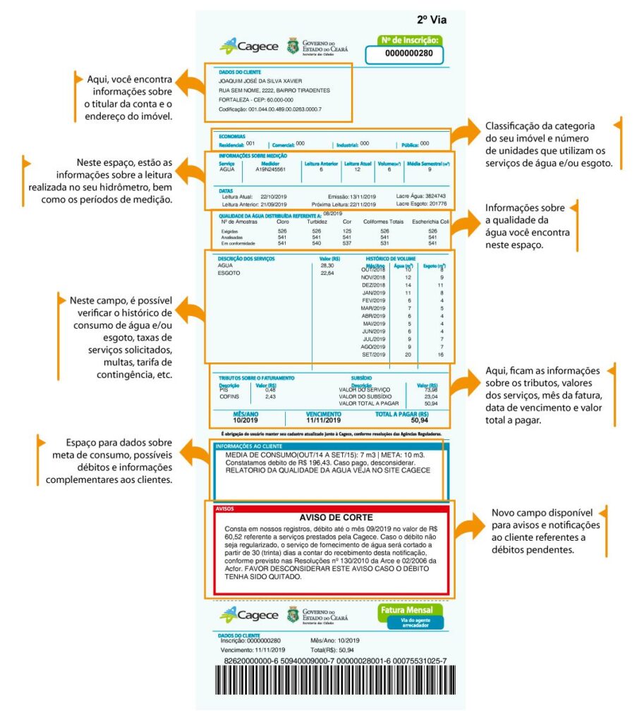 Nessa fatura, há informações sobre o titular, o endereço do imóvel, bem como dados da leitura atual e anterior, informações sobre a qualidade da água, taxas, multas e o valor dos serviços ofertados: água e/ou esgoto.